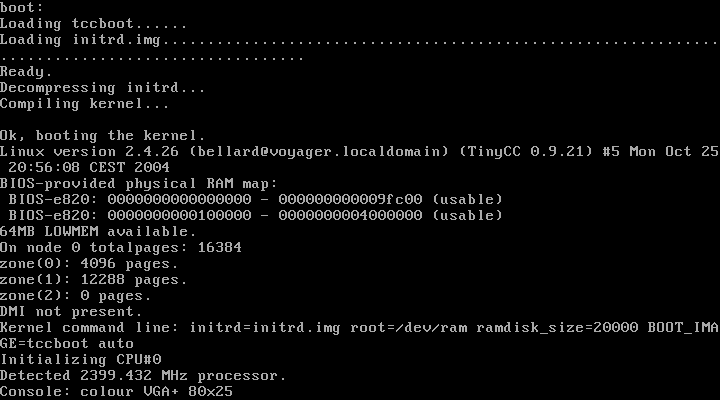 TCCBOOT is only 138 KB big (uncompressed code) and it can compile and run a typical Linux kernel in less than 15 seconds on a 2.4 GHz Pentium 4.